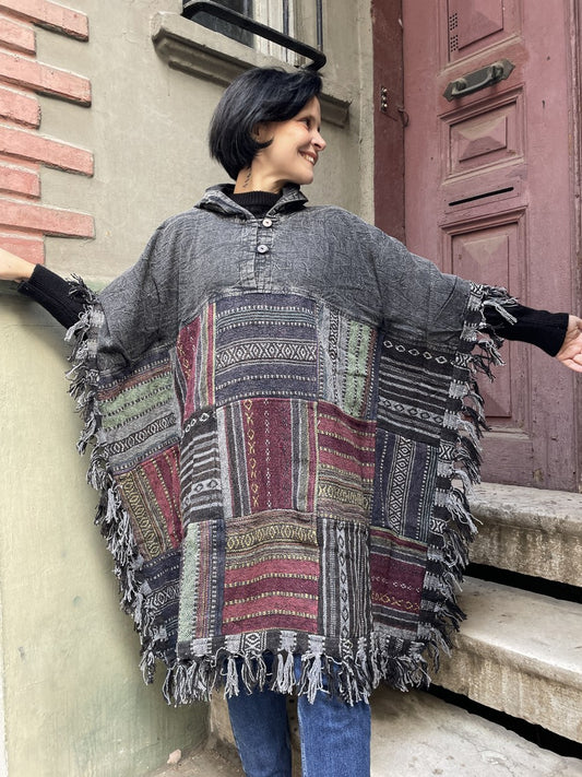 Unisex Antrasit Nepal Patchwork Kışlık Panço – El Yapımı, Cotton & Baja Kumaş