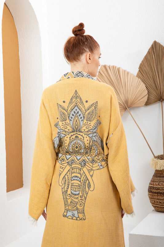 Sarı Bohem Kadın Fil Desenli Doğal Kumaş Kimono Bornoz Kaftan