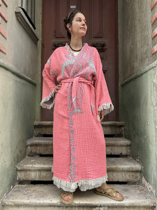 Renkli Kadın Neon Fil Desenli Doğal Kumaş Kimono Bornoz Kaftan
