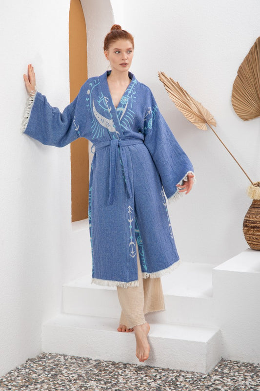 Saks Mavi Bohem Kadın Göz Desenli Doğal Kumaş Kimono Bornoz Kaftan