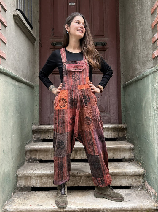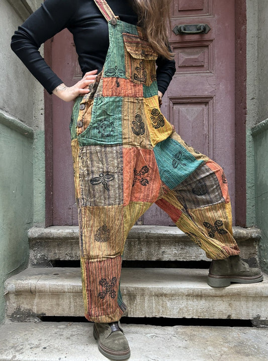 Unisex Bohem Toprak Yeşil Nepal Patchwork Tulum
