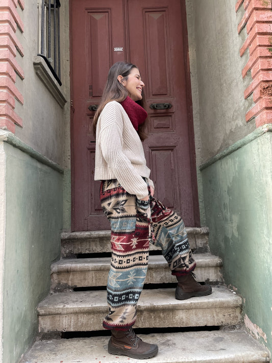 Unısex Çizgili Nepal Yün Ok Desenli Krem Bordo Kadın Pantolon