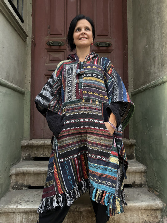 Unisex El Yapımı Patchwork Nepal Renkli Gheri Kapüşonlu Panço