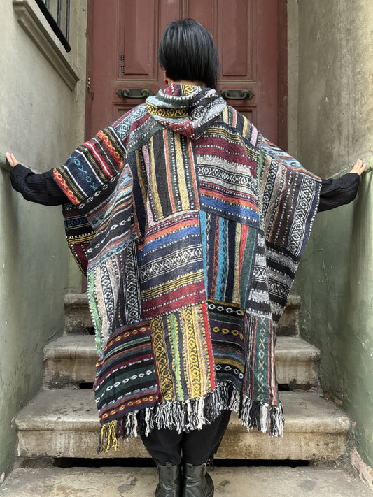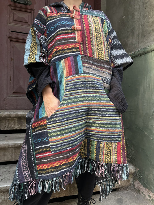 Unisex El Yapımı Patchwork Nepal Baja Gheri Kapüşonlu Panço