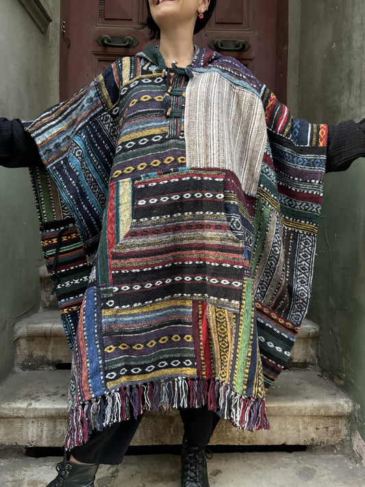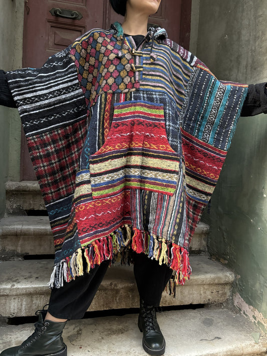 Unisex El Yapımı Patchwork Nepal Gheri Kapüşonlu Panço
