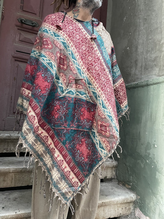 Unisex Kapüşonlu Etnik Desenli Bohem Nepal Panço - Bordo ve Yeşil Tonlarında