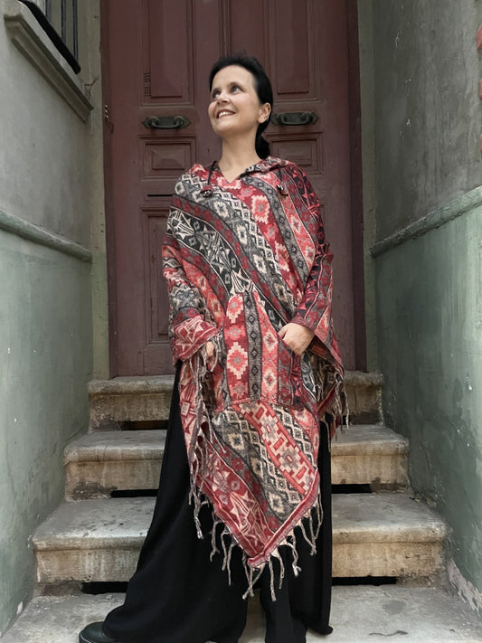 Unisex Kapüşonlu Bohem Nepal Panço - Kırmızı ve Siyah Etnik Desenli, Rahat ve Şık