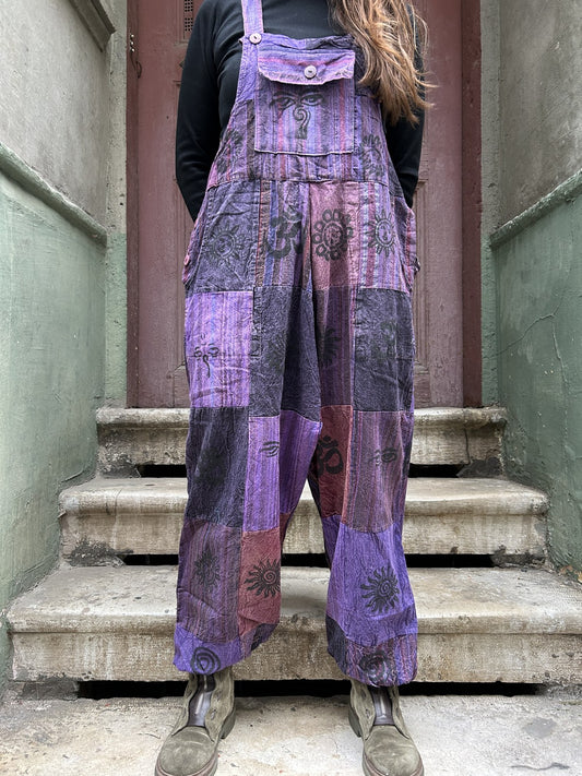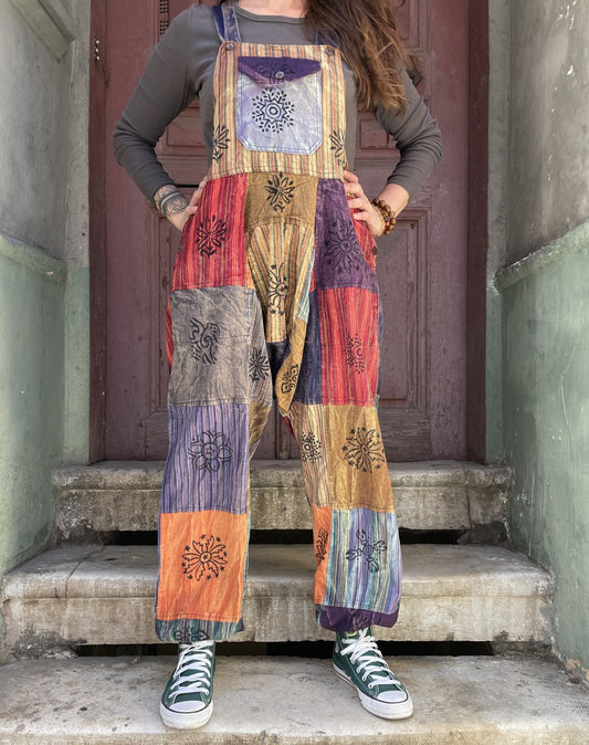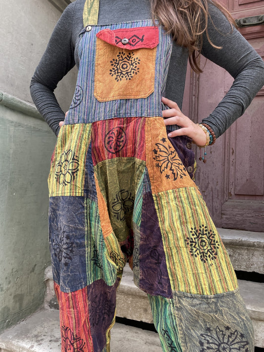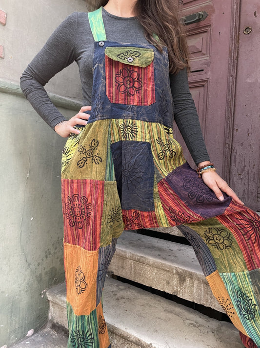 Unisex Mavi Kırmızı Nepal Patchwork Tulum