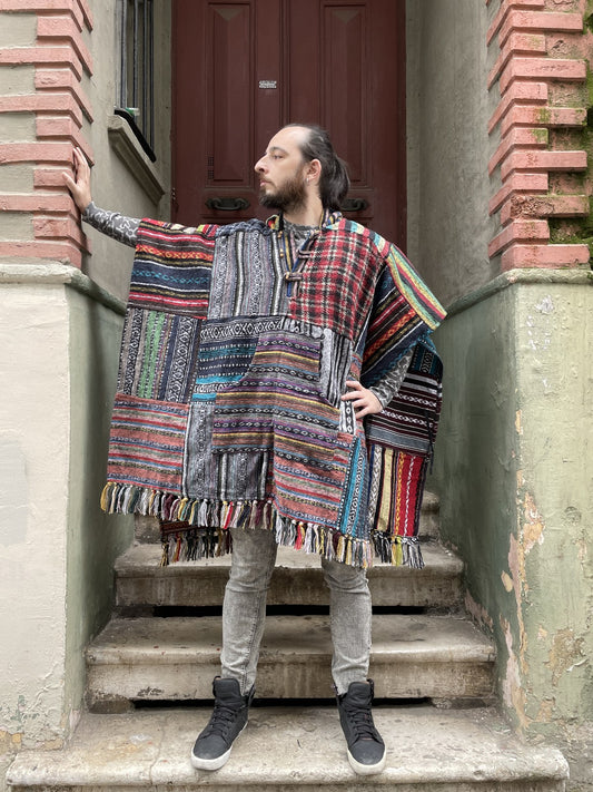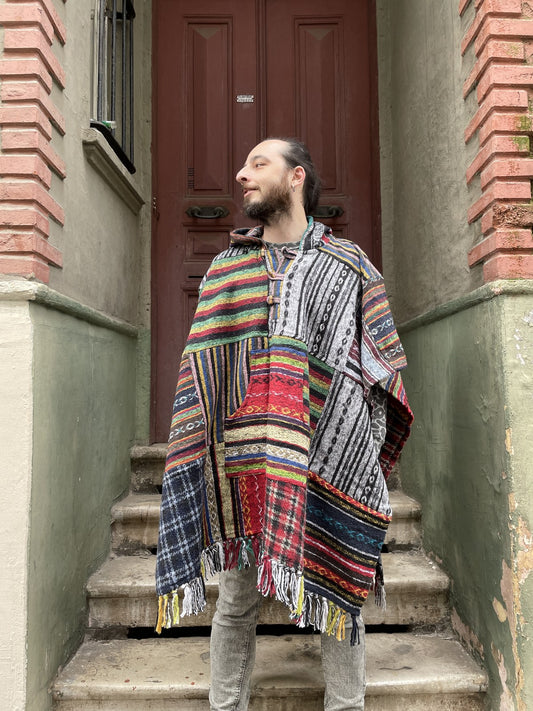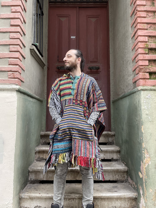 Unisex Nepal Gheri Sarı Kırmızı Panço