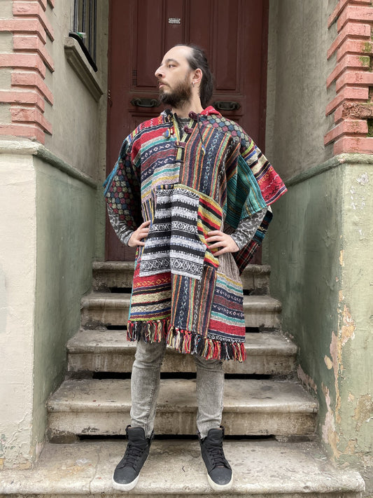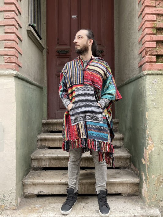 Unisex Nepal Gheri Yeşil Kırmızı Panço