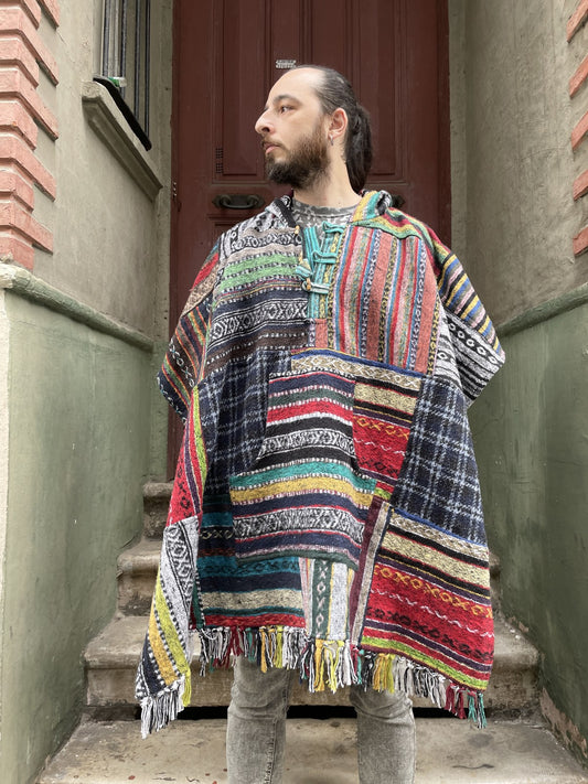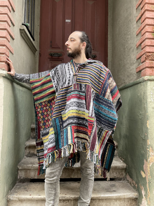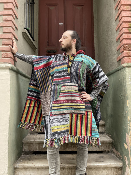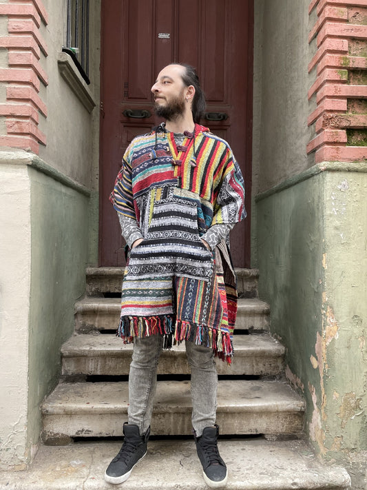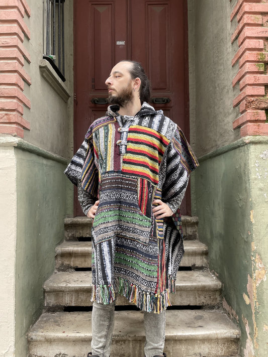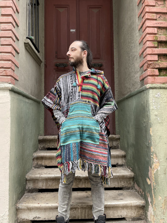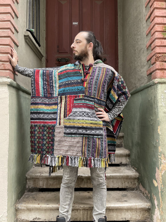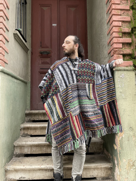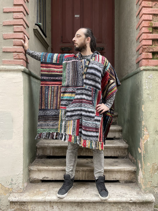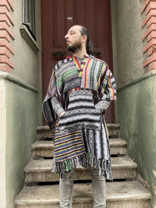 Unisex Nepal Gheri Siyah Beyaz Yeşil Panço