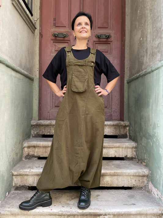 Unisex Yeşil Nepal Bahçıvan Salopet Tulum - %100 Pamuk, Rahat ve Bohem Stil
