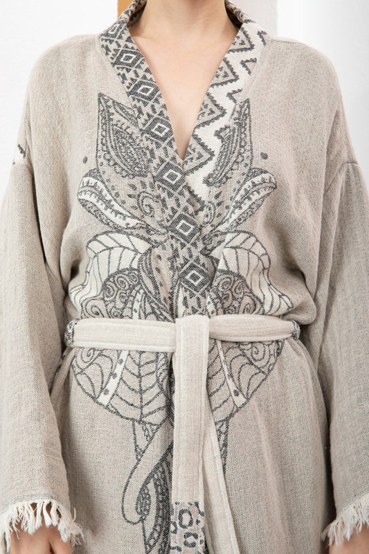 Vizon Gri Bohem Kadın Fil Desenli Doğal Kumaş Kimono Bornoz Kaftan