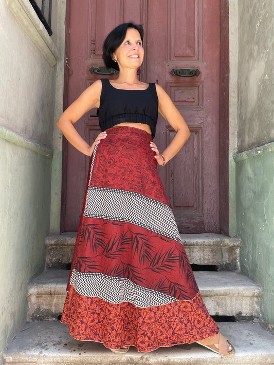 Bohem Çift Taraflı Kırmızı Bağlamalı İpek Etek