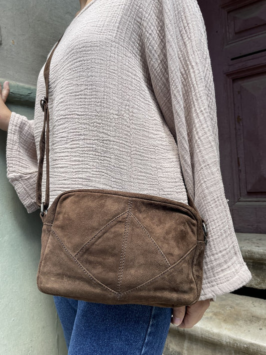 Bohem Süet Mini Deri Çanta – Ayarlanabilir Askılı - Kahve