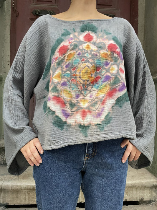 Batik Müslin Bluz – “Aurora” | El Boyaması Mandala Desenli Gri Bohem Tasarım