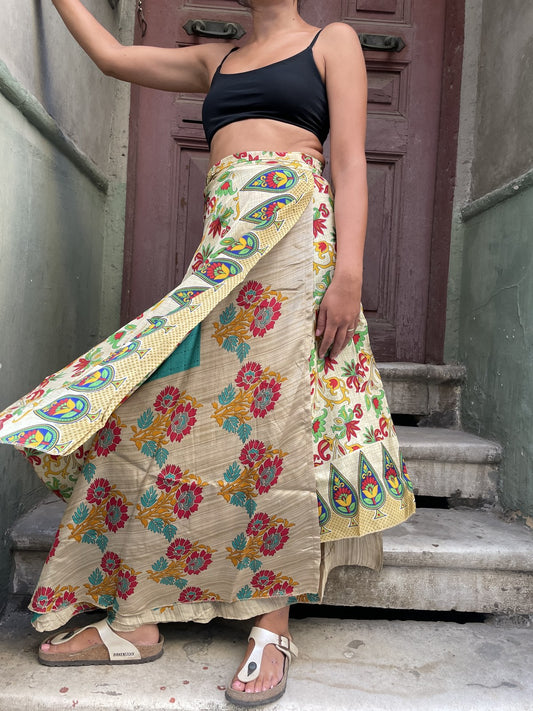 Nepal İpek Çift Taraflı Bağlamalı Etek – Etnik Çiçek Desenli