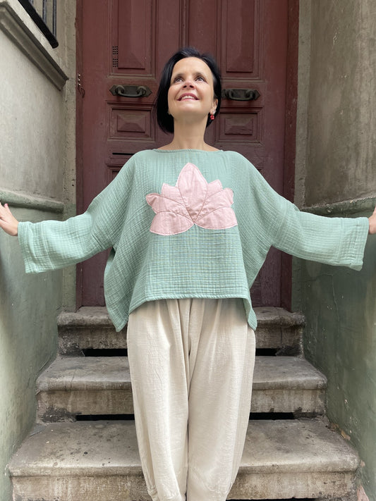 Özel Tasarım Lotus Desenli Müslin Bluz – Mint