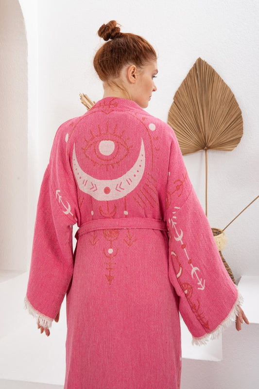 Pembe Bohem Kadın Göz Desenli Doğal Kumaş Kimono Bornoz Kaftan