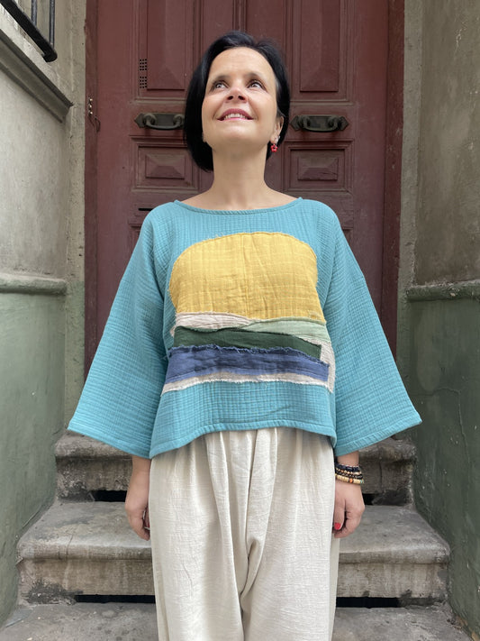 Özel Tasarım Güneş Desenli Müslin Bluz – Mavi Yeşil