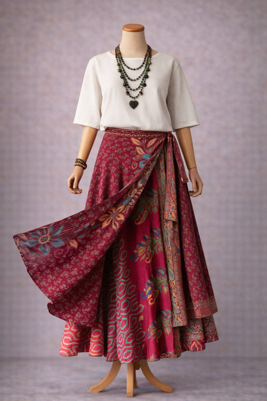 Çift Taraflı Bağlamalı İpek Etek – Bordo Çiçek Desenli (Nepal)