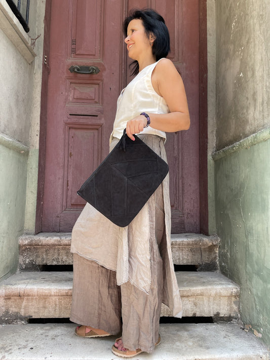 İki İşlevli Süet Deri Çanta – Portföy ve Omuz Çantası - Siyah
