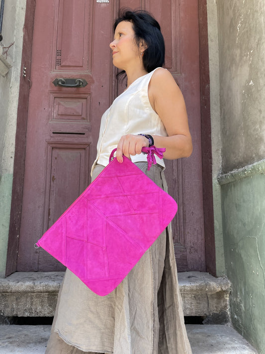 İki İşlevli Süet Deri Çanta – Portföy ve Omuz Çantası - Fuşya