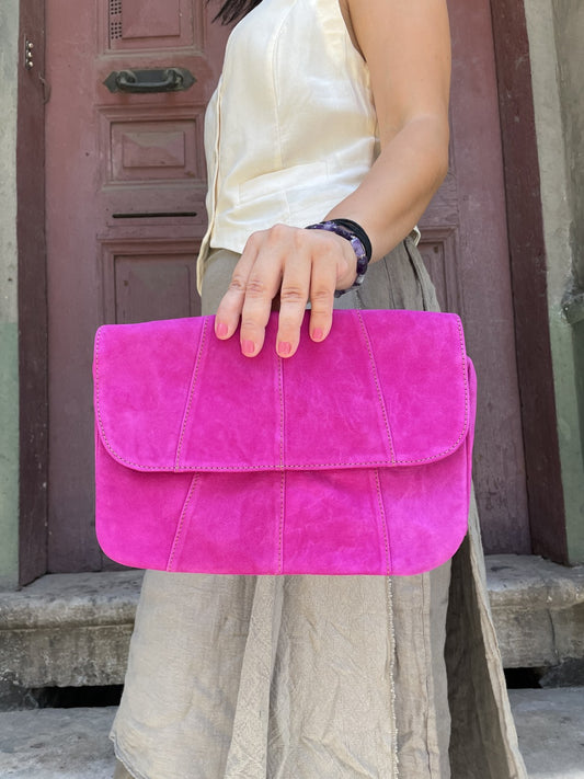 Bohem Süet Deri Kapaklı Çanta – İki Kullanım Seçeneği ile Şıklık ve Konfor - Fuşya