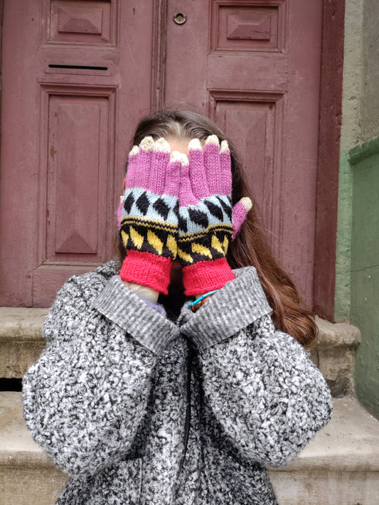 Bohem Etnik Desenli Yün Mavi Pembe Eldiven
