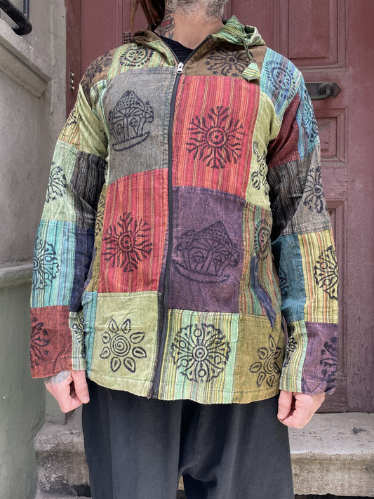 Nepal Patchwork Fermuarlı Erkek Gömlek - Yeşil Kırmızı