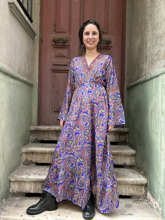 Paisley Desenli Sırt Dekolteli Uzun İpek Elbise – Bohem Şıklık