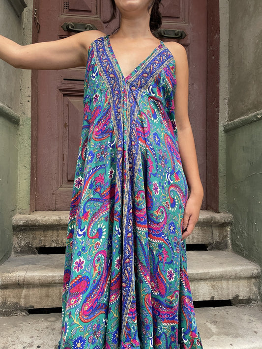 Paisley Desenli İpek Maxi Elbise – Ayarlanabilir Askılı