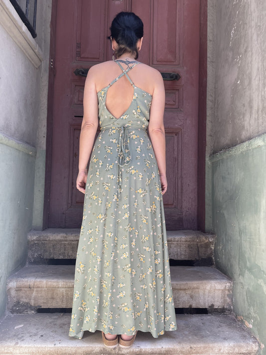 Bohem Yeşil Çiçekli Anvelop Elbise