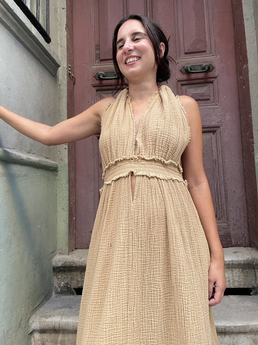 Müslin Örgülü Sırtı Açık Kahve Elbise