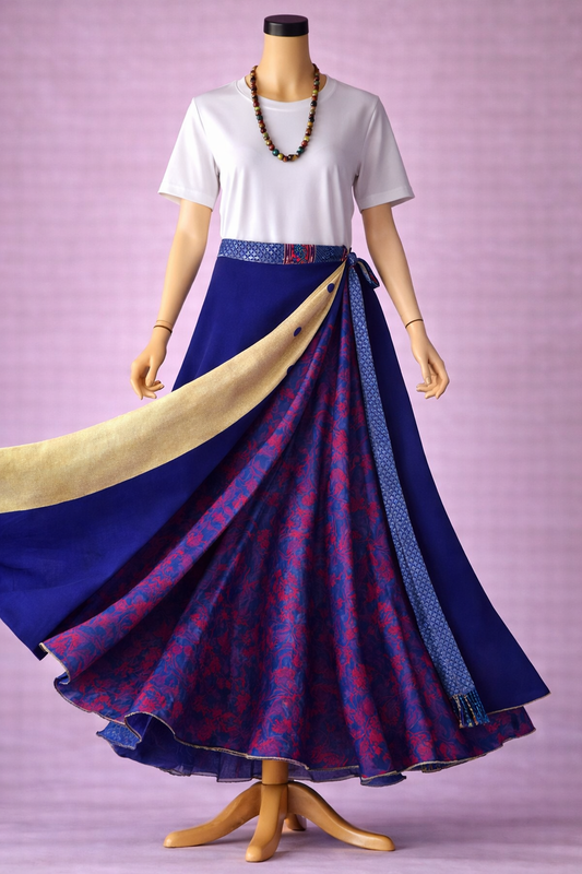 Çift Taraflı Bağlamalı İpek Etek – Saks Mavi Desenli (Nepal)