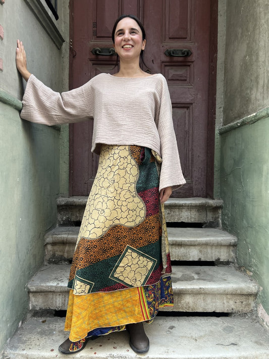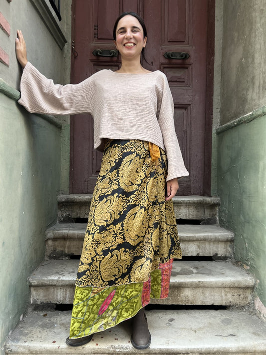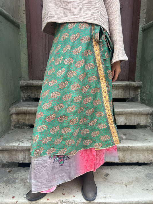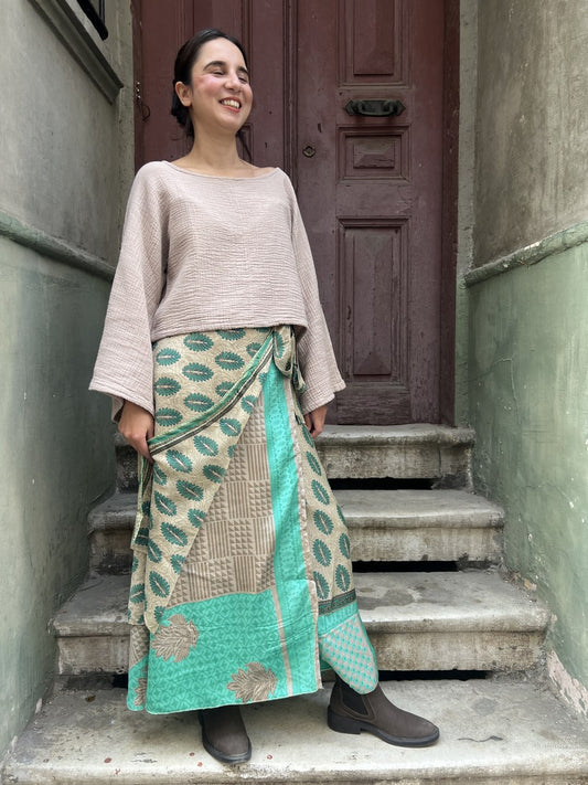 Nepal Çift Taraflı İpek Etek – Yeşil Desenli, El Yapımı, Bohem Tarz