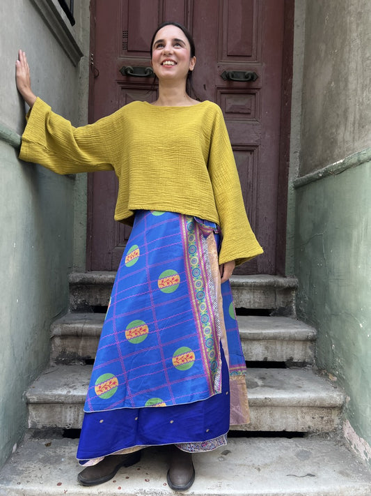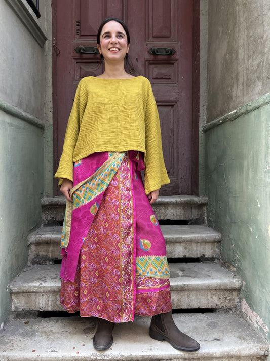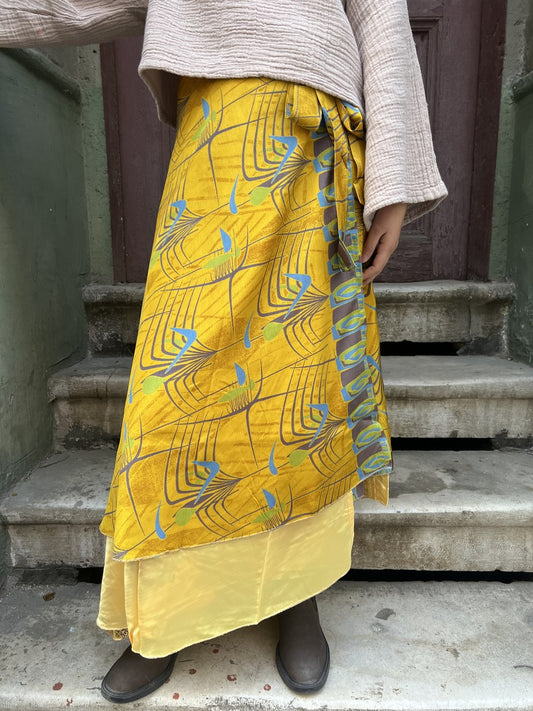 Nepal İpek Çift Taraflı Bağlamalı Etek – Sarı Desenli