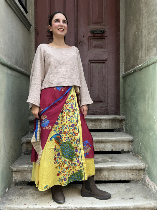 Çift Taraflı Nepal Bohem İpek Etek – Bordo Sarı Desenli