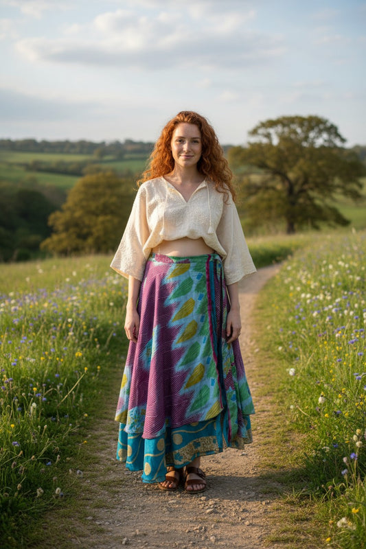 Çift Taraflı Bağlamalı İpek Etek – Mavi Mor Desenli (Nepal)
