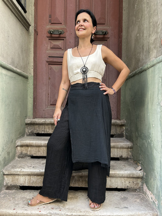 Unisex Kadın Bohem Keten Etekli Pantolon - Doğal ve Bohem Tarz