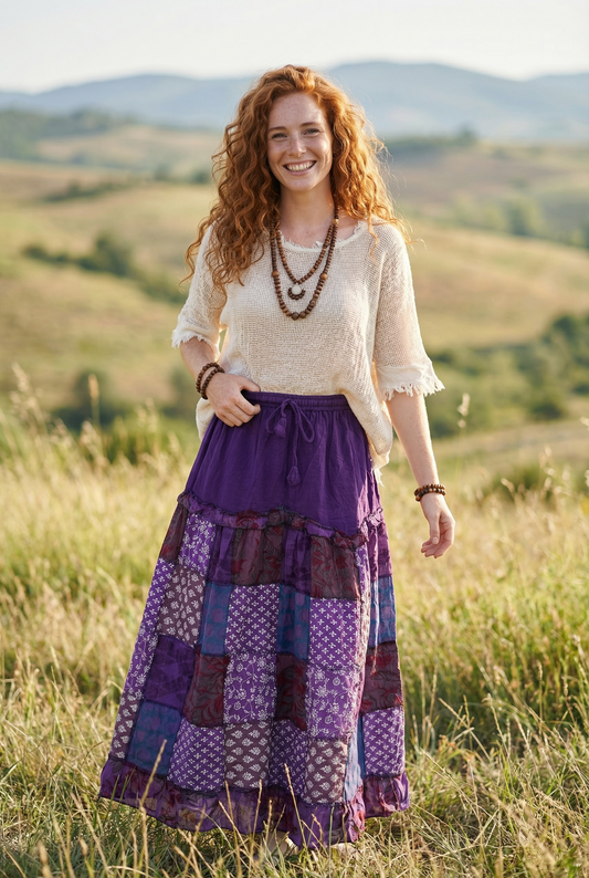 Nepal Patchwork Bohem Etek – %100 Pamuk, Lastikli Bel – Mor