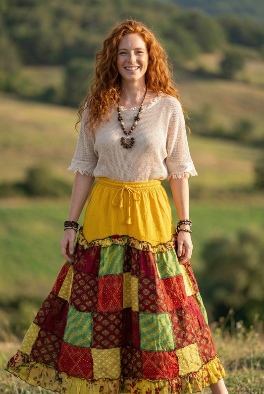 Nepal Bağlamalı Patchwork Etek – Bohem Tarz, Rahat ve Renkli