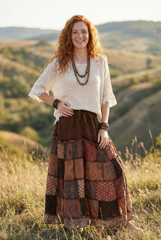 Nepal Patchwork Bohem Etek – %100 Pamuk, Lastikli Bel – Kahve