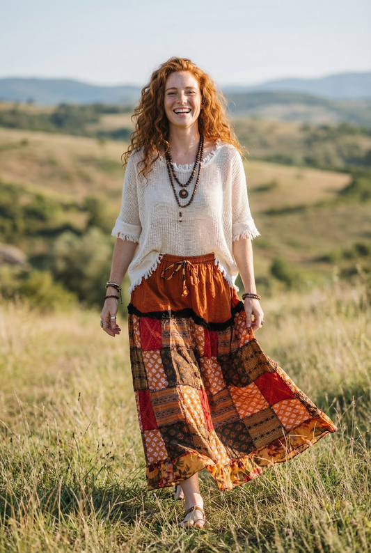 Nepal Patchwork Bohem Etek – %100 Pamuk, Lastikli Bel – Kiremit