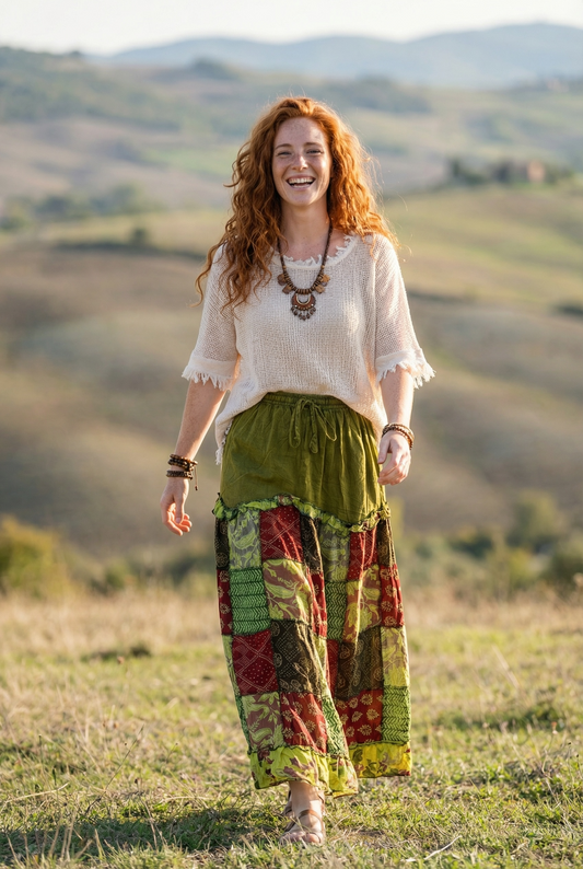 Nepal Patchwork Bohem Etek – %100 Pamuk, Lastikli Bel – Yeşil