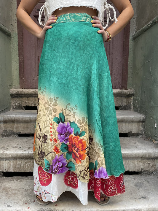 Nepal İpek Çift Taraflı Bağlamalı Etek – Yeşil Çiçek Kırmızı Desenli
