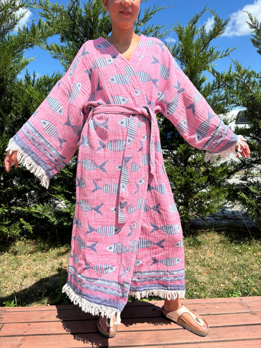Balık Desenli Pamuk Kaftan Kimono– Kadın Bohem Stil – Pembe