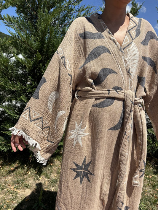 Güneş Desenli Pamuk Kaftan Kimono Bornoz – Kadın Bohem Stil – Toprak