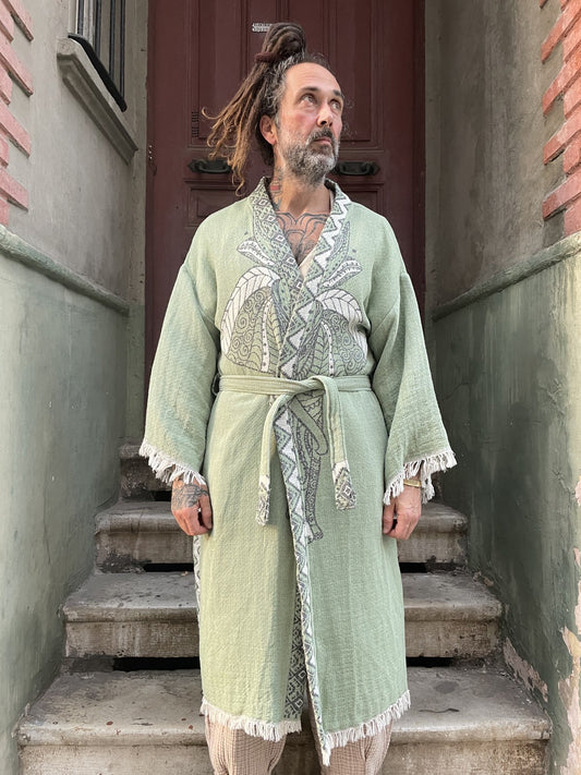 Yeşil Bohem Kadın Fil Desenli Doğal Kumaş Kimono Bornoz Kaftan