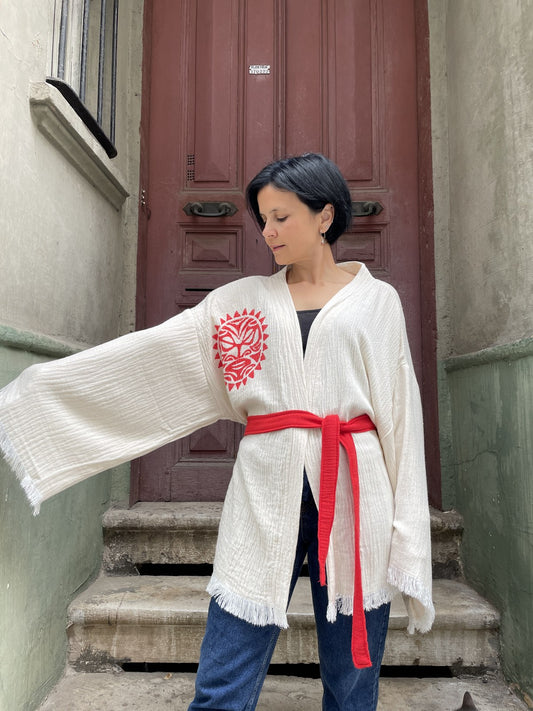 Kırmızı Güneş Desenli Kadın Müslin Kimono